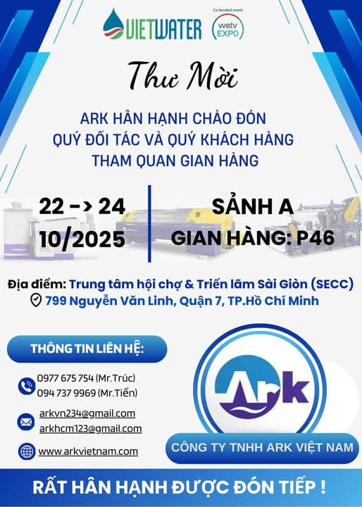 Công ty TNHH ARK Việt Nam, với sự kết hợp giữa công nghệ hàng đầu Hàn Quốc và năng lực bản địa hóa tại Việt Nam (với nhà máy tại Bắc Ninh cùng văn phòng tại Hà Nội và TP.HCM), trân trọng thông báo và kính mời Quý vị đến thăm gian hàng của chúng tôi tại sự kiện ngành nước quốc tế lớn nhất Việt Nam – VIETWATER 2025.